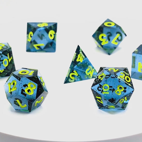 June 2025 Exclusive - Say hello to Firefly Nights! Our June exclusive is a translucent navy with flashes of yellow green glitter reminiscent of summer evenings filled with the flashes of magical firefly light. Inked in light fluorescent yellow with inked stealth Sneak Attack Dice logo on D20.