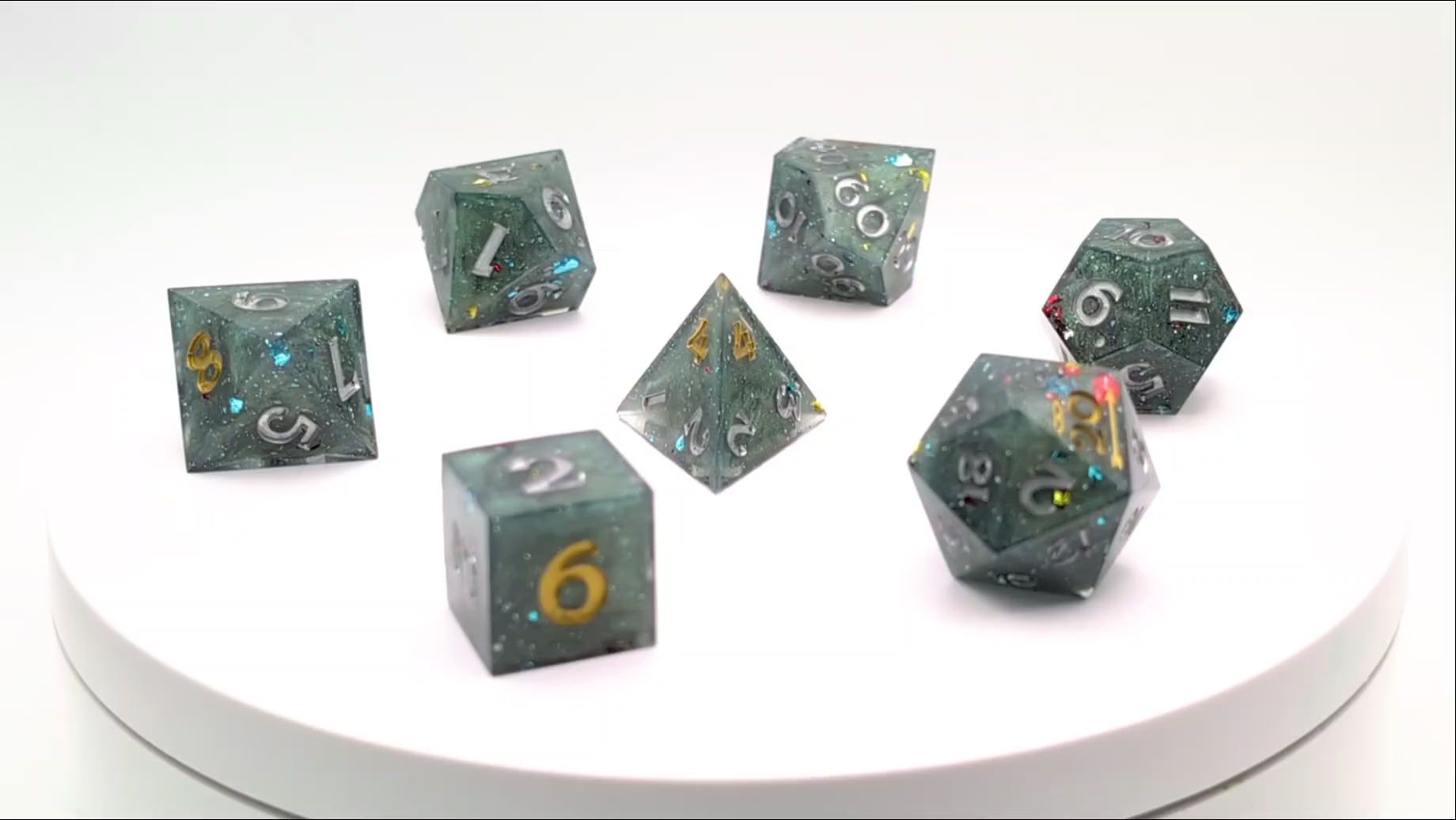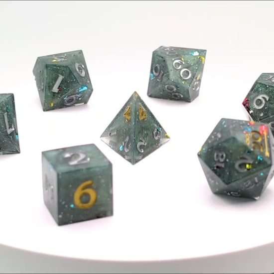 December 2025 Exclusive -Tannenbaum is a deep pine mica shelled in a clear coat with festive frosty sparkles and multi colored metallic flakes. They are inked in tinsel silver with high numbers of each die in star gold with inked stealth Sneak Attack Dice logo on D20.