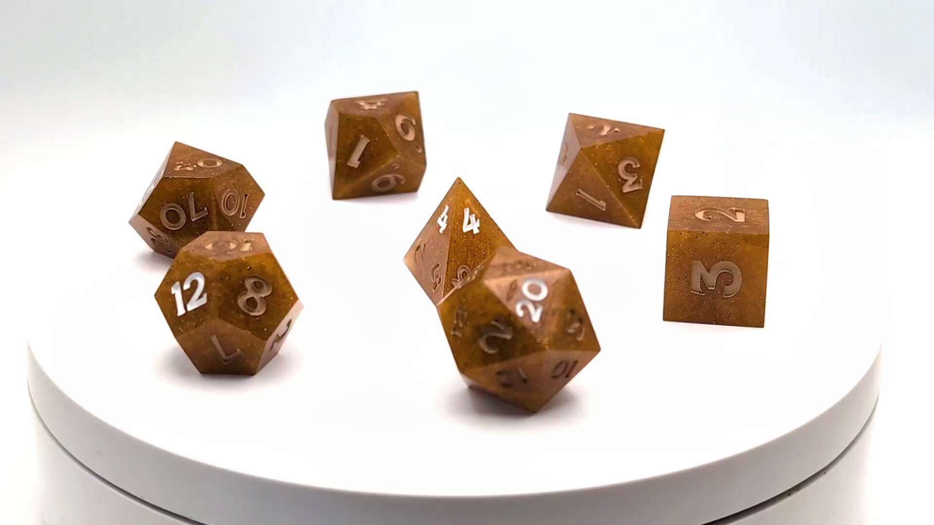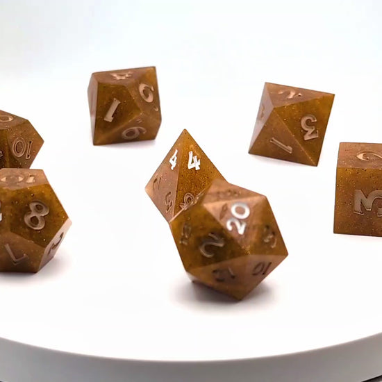 October 2025 Exclusive - Get a taste of fall goodness with our Pumpkin Pie Dice! These pumpkin colored mica dice with ultra fine spice colored glitter are inked in golden brown with white whipped cream high numbers and un-inked stealth Sneak Attack Dice logo on D20.